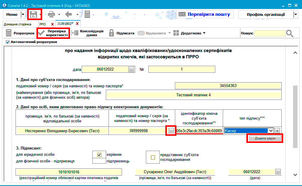 В таблиці заповнюєте: ПІБ відповідальної особи; Податковий номер (або серія та номер паспорта); Ідентифікатор ключа суб’єкта господарювання та вибираєте тип підпису.